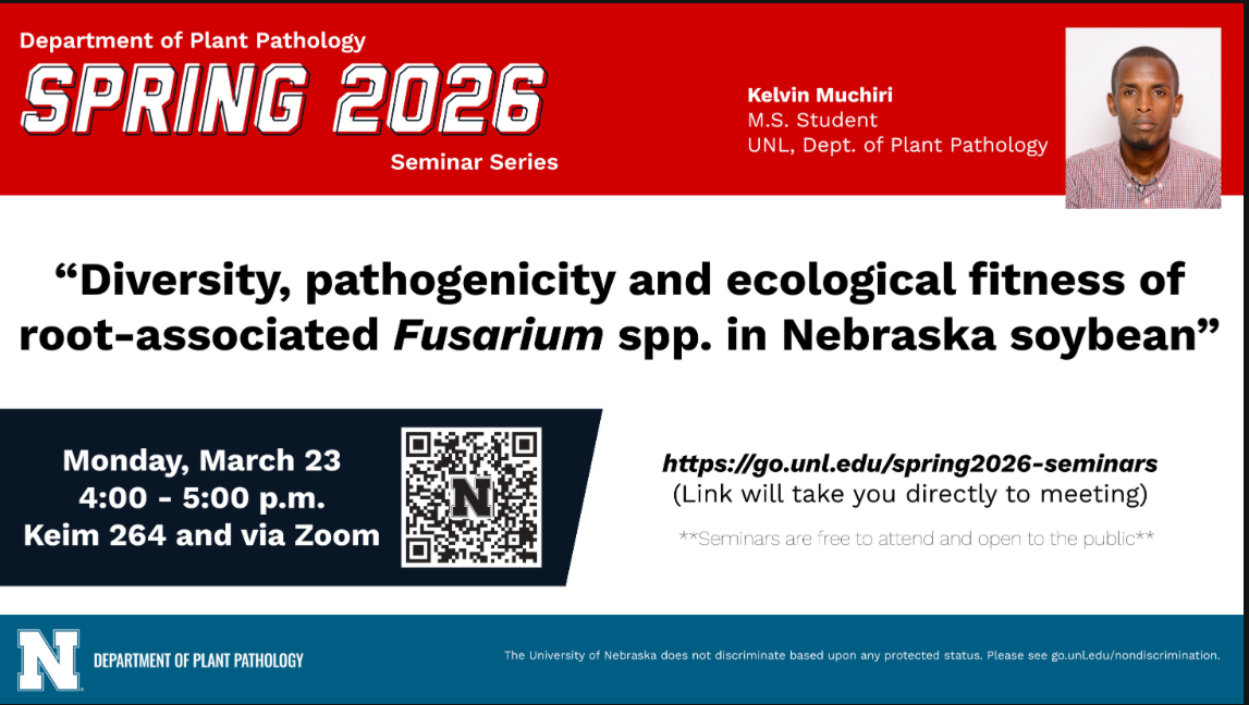 Kelvin delivered a departmental seminar on Monday, March 23rd, 2026. His seminar was titled: "Diversity, pathogenicity, and ecological fitness of root-associated Fusarium spp. in Nebraska soybean". Congratulations, Kelvin!