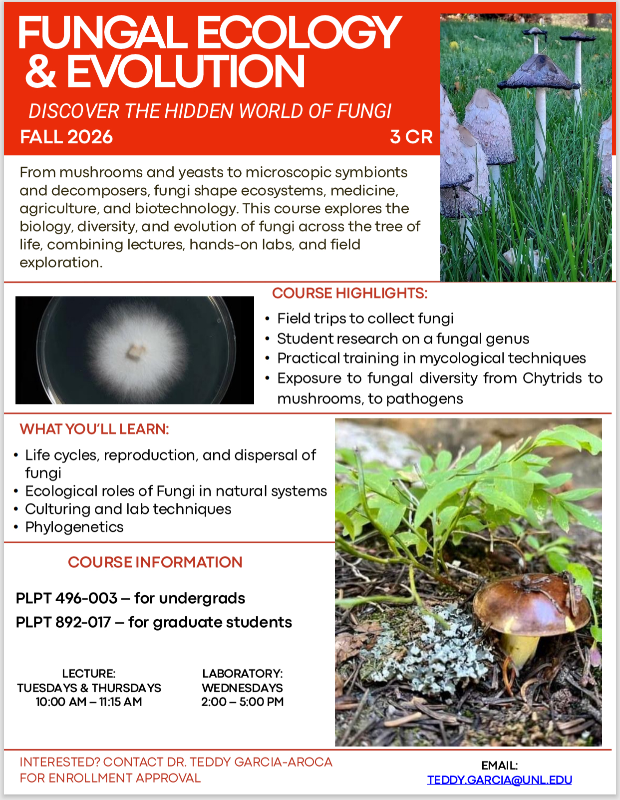 PLPT 496/892: Fungal Ecology & Evolution - This course focuses on exploring the ecology and evolution of Fungi and some fungal-like organisms.